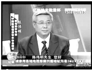在一家電視臺播出的億康納米能量杯的廣告中,一位學者打扮的人端坐當中,文字顯示,他叫陳偉明,是中國醫促健康飲水協會理事。而在另一幅華佗延壽酒的廣告視頻截圖中,還是那位“陳偉明”,可文字顯示其姓名卻變成了關新良,身份也變成了《北京中醫》雜志編委、中國中西醫結合協會理事、北京中日友好醫院主任醫師。第三幅截圖來自天地磁療儀的電視廣告,這個“陳偉明”又成了一名心臟病患者,一臉痛苦表情。