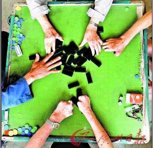 下午1時多,馬曲頭還沒有開始生火煮粥,而不遠處則傳來麻將的聲音,那里是個娛樂室,面積不大,只有10多個平方米,擺了兩桌麻將,一桌牌九。推牌九的其中一位老人已90歲了,但他氣色不錯,頭腦也清醒。4個老人用殘破的雙手玩牌。