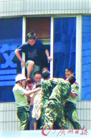 中午12時左右,4名消防官兵突然從另外一邊的窗口出現在平臺上,由于平臺是繞著醫院的柱形墻體修建的,挾持人質的女子并沒有發現救援的官兵。趁著談判人員吸引該女子注意力的時候,四名消防官兵慢慢向女子所站的地方接近。