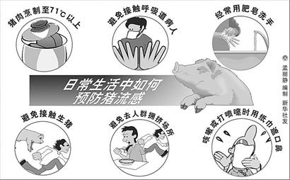 避免接觸流感樣癥狀(發熱,咳嗽,流涕等)或肺炎等呼吸道病人;注意個人衛生,經常使用肥皂和清水洗手,尤其在咳嗽或打噴嚏后;避免接觸生豬或前往有豬的場所;避免前往人群擁擠場所;咳嗽或打噴嚏時用紙巾遮住口鼻,然后將紙巾丟進垃圾桶;如在境外出現流感樣癥狀(發熱,咳嗽,流涕等),應立即就醫(就醫時應戴口罩),并向當地公共衛生機構和檢驗檢疫部門說明。