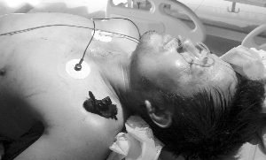 在同仁醫院急診室,記者見到了受傷的民工。他躺在病床上動彈不得,兩邊耳廓后面還在流血,左邊肩部,一根比拇指還粗的螺紋鋼筋,從腋下一直穿到肩部,肩膀外面露出一寸多長的鋼筋頭。鋼筋還被一層布包著,那是民工的衣服,鋼筋戳到他時,衣服也被一起戳進了肉里。