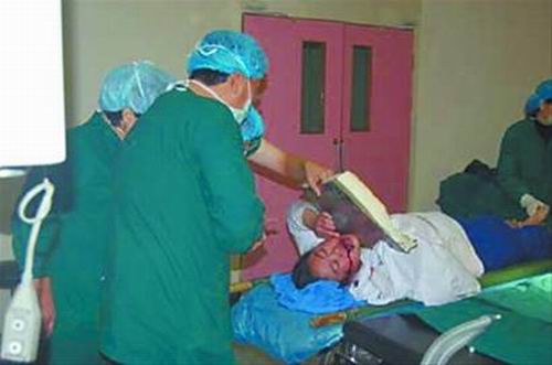 8時多,剛到醫院的張紅立刻被推上手術臺。“我從醫17年,還是頭一次見到這樣的病例!笨谇豢浦魅问Y衛東說:“門把手就像個十七八厘米長的大魚鉤,把她整個鉤住了,腦袋掛在把手上,好在把手是光滑的、鈍的,沒有刺到后顱腦,要不,誰也拿不下來”。