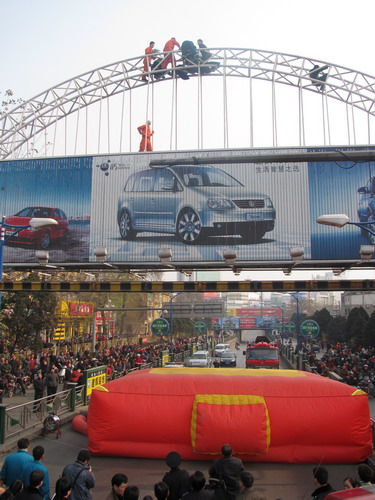 考慮到該男子的人身安全,飯店老板當場答應拿出100塊錢對其補償,然而廣告架上的男子突然改變了注意,提出了一個荒唐的理由,聲稱要市長到場自己才肯下來。時間一秒一秒的過去了,僵持還在繼續,所有的勸說都是徒勞,此時廣告架下邊的的救生氣墊也出現了意外,原來,向氣墊里充氣的充氣機因長時間使用,機器的油料快用完了,于是現場指揮員立即對充氣機進行了更換。由于現場圍觀群眾太多,指揮員馬上與大隊取得了聯系請求消防二中隊前來增援。