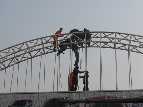 12月18日上午,許昌市一男子因100元工資糾紛,竟然攜帶汽油爬到位于市區解放路與許繼大道交叉口的鐵路立交橋附近一座十六七米高的廣告架上欲跳塔自焚,在勸說無果后,該男子飲下隨身攜帶的汽油后全身抽搐掛在半空中!關鍵時刻,數10名消防官兵一擁而上,成功將其從廣告架上救下送往醫院搶救。