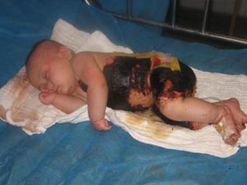 昨日(12月30日),記者在187醫院燒傷科307房看到,男嬰黃堂國躺在床上,前胸、右腿和臀部等被嚴重燙傷,燙傷處被涂上了厚厚的藥膏。黃堂國的父母在病床前不停嘆息,“因借不到錢,現在醫院已經停止對孩子用藥了!秉S堂國的母親告訴記者,她家住海口市龍華區遵譚鎮群力村委會美萬村。12月19日晚,她正準備給孩子洗澡,當時先往盆里放熱水,正想放冷水時忽然想起忘了給孩子拿衣服,就在她出去拿衣服時,孩子不慎掉進了熱水盆,“當時孩子被燙得哇哇直哭”。