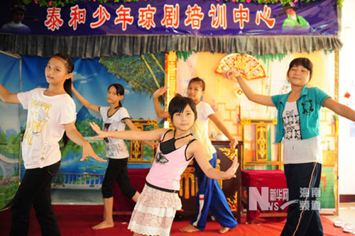 海南瓊海市退休教師王昱為傳承地方戲劇,用退休金義務創辦“泰和少年瓊劇培訓中心”。他的義舉得到社會各界的支持和幫助,開班兩年多來有近百位孩子前來培訓班學習,學員當中最大的15歲,最小的才4歲。參加培訓的孩子常被邀請到各地演出,精彩的表演受到戲迷們的歡迎。培訓班里的6名學員在一次全省瓊劇擂臺爭霸賽中,從1800名選手中脫穎而出,成功晉級50強,其中兩人晉級8強,10歲的符小玉憑借嫻熟的唱、念、做、打征服評委和觀眾,奪得大賽三等獎。(新華網/蒙鐘德 攝)
