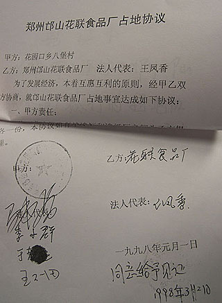 王鳳香出示了一張“土地承包合同”和一張“鄭州邙山花聯食品廠占地協議”。