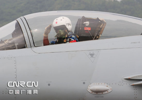 勝利返航,航空兵某師副師長、空軍特級飛行員嚴鋒招手致意。