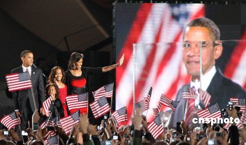 圖為奧巴馬與妻兒在芝加哥慶祝晚會(huì)現(xiàn)場(chǎng)。