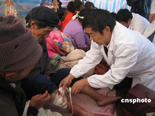 圖為十一月六日,楚雄市醫院副院長杜國才正在安置點為一位骨折災民包扎傷口,因醫療條件有限,目前只能做緊急處理。