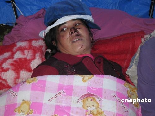 圖為村民王光蘭在被埋五個多小時被村干部救出,被醫護人員治療后在救災帳篷中休息。中新社發 劉子倩 攝