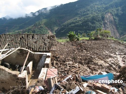 圖為泥石流過后,新華村下屬一村民小組被夷為平地,大部分房屋都只剩下斷墻和碎瓦。中新社發 劉子倩 攝