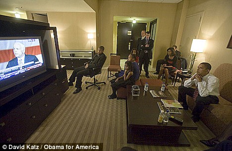 奧巴馬在芝加哥賓館的一個房間里的大屏幕電視收看他的對手、共和黨總統(tǒng)候選人麥凱恩發(fā)表承認落選講演時看起來很嚴肅,他好像處于思考狀態(tài),這很符合他的外號“毫無戲劇效果的奧巴馬”。奧巴馬身體前傾,把雙手放在下巴下,非常關(guān)注地聽著麥凱恩的講演。