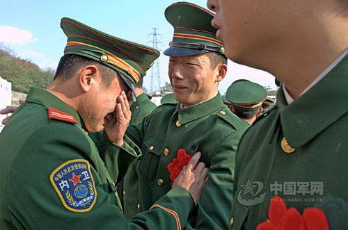 武警南京市支隊舉行退伍士兵歡送儀式,即將退伍的老兵和前來送別的戰(zhàn)士早已淚流滿面。中國軍網(wǎng)發(fā) 韓華攝