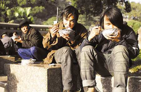 在紅日亭施粥攤前, 領(lǐng)到粥的人在津津有味地吃粥