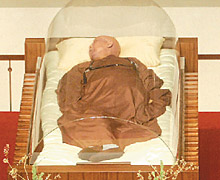 昨天政、商、宗教各界代表及信眾們前往瞻仰法師最后一面。方丈和尚向來賓講解懸掛堂中,書法家杜忠誥老師所寫的師父最后叮囑“寂滅為樂”以及四句偈“無事忙中老,空里有哭笑,本來沒有我,生死皆可拋。”說明圣嚴法師一向“歡喜看生死”的態(tài)度。