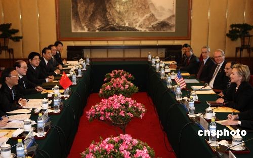 2月21日上午,中國外交部部長楊潔篪與美國新任國務卿希拉里·克林頓在北京釣魚臺國賓館舉行會談。中新社發 任晨鳴 攝