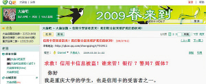 重慶大學(xué)B區(qū)學(xué)生小朱在網(wǎng)上發(fā)帖子,欲發(fā)起成立“信用卡反盜刷聯(lián)盟”。昨日,小朱稱,這個(gè)想法緣于自己的信用卡被盜刷,在維權(quán)時(shí)感到勢(shì)單力薄。