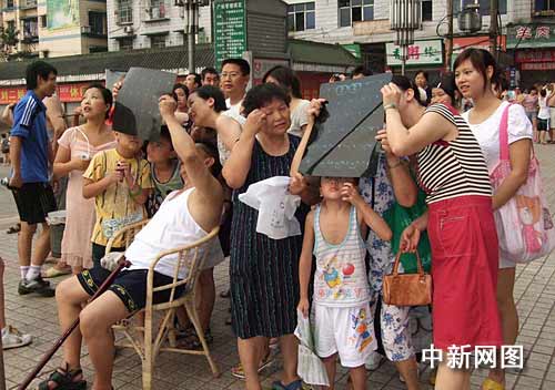7月22日上午,500年一遇的日全食天文奇觀讓整個宜賓縣沸騰了,老老小小,男男女女都跑出來觀看。記者在現(xiàn)場看到,有戴著墨鏡觀看的,有拿望遠(yuǎn)鏡觀看的,有用焊工專用鏡觀看的,有拿茶葉包裝紙觀看的,有人用照相機照著相,有人用著攝像機……廣場上、院子里、壩壩頭到處站滿了人,大家都擠在一起驚嘆著:“看,太陽慢慢變小了,成月亮了,只有光圈了,天黑了……”