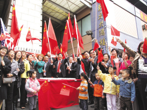 2009年是新中國(guó)60周年華誕,9月21日,美東華人社團(tuán)聯(lián)合總會(huì)在華埠升起五星紅旗。25日,一群80后青年學(xué)子在華埠且林士果廣場(chǎng)慶祝。10月1日,福建公所在華埠主要商業(yè)街兩旁?huà)焐锨嬷忻纼蓢?guó)國(guó)旗。