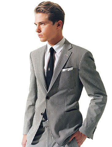 七:條紋外套?肯定!再發(fā)愁你的條紋西裝沒(méi)法穿么?的確,如今大概只有四歲的孩子和沒(méi)有時(shí)尚品味的人才會(huì)選擇那種淺色的泡泡紗外套來(lái)作為自己的“出場(chǎng)”服裝。但是,告訴你個(gè)方法,只要簡(jiǎn)單的加上黑色和白色的話,這款搭配就變得相當(dāng)?shù)挠行汀⒊墒炝恕4钆浒咨囊r衫,黑色的領(lǐng)帶,和一塊口袋方巾,那么無(wú)論是日常的辦公或者是小型的PARTY聚會(huì),就都很合適了!!
