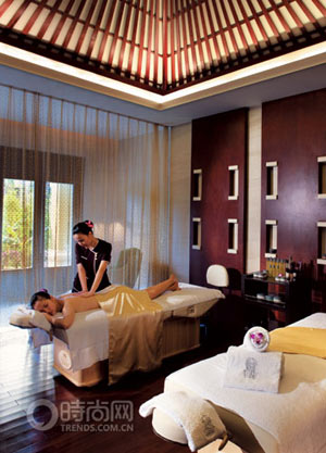大堂所在地是一座高高在上的宮殿式建筑,檐角高挑,莊重有儀,進(jìn)來后,一條長長的木廊道直通向光的盡頭,皇家的氣派表露無遺。整個(gè)酒店的設(shè)計(jì)靈感則來自北京頤和園的經(jīng)典建筑設(shè)計(jì),包括斜尖屋頂、深色實(shí)木、復(fù)雜細(xì)致的雕刻和馬賽克鑲嵌裝飾等,精品購物店的外墻讓人熟悉地看到天安門城樓的影子,而名為“雪閣”的雪茄吧看上去就像微縮的天壇。這是亞龍灣面積最大的酒店,空間足夠開闊,除了主體建筑和附屬設(shè)施外,33座備有私人管家及獨(dú)立泳池的私家別墅散落在亞龍灣幽靜的細(xì)白沙灘和紅樹林保護(hù)區(qū)之間,據(jù)說每座別墅都有露天日光浴平臺(tái),還有水天相接的無邊際泳池,這種奢華而私密的家庭度假并不適合一個(gè)人來此的我。在去往房間的通道里,一樣能感受得到酒店空間上的奢華:所有的房間都只靠一側(cè),走廊的另一側(cè)是通透的玻璃大窗,風(fēng)景不只屬于陽臺(tái),走路的人也可以看到風(fēng)景!