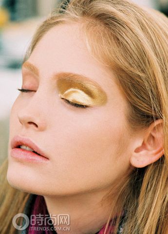 在金色眼影上畫一條粗細適當?shù)难劬,畫眼線時不妨將臉部的角度調整得低一點,可以讓眼尾有自然的幅度。在黑眼球的上方,輕輕地重復加強描繪,由眼角往眼尾方向慢慢加粗,然后用棉花棒將描繪過的眼線暈開,可以讓眼線線條變得柔和、立體。