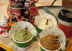 上面有用以鮮奶油調(diào)和層層交迭的栗子泥、抹茶跟焦糖餡,并在頂端灑上雪白的糖粉,呈現(xiàn)充滿冬季耶誕氛圍的白朗峰造型。最后插上可愛的脆笛餅干,搭配雪花點(diǎn)綴的杯身,好像一棵棵美麗的圣誕樹一般,尤其搭配圣誕餐桌更有FU~。