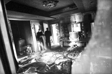 昨日上午9時30分許,記者在火災現場看到,房屋客廳內一片狼籍,地板、沙發、電視機等都被燒毀,窗戶被撬開,墻壁都被熏黑了,門前有一個使用過的滅火器。 民警、消防人員正在勘查現場。
