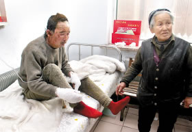 昨日,記者來到長春燒傷醫(yī)院,見到了母子兩人。42歲的崔某頭部、面部、雙手等處被燒傷,雙手纏著厚厚的紗布。崔某83歲的母親一直在病房?jī)?nèi)照顧兒子。