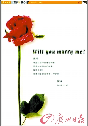“婉君,Will you marry me?希望以后不用送你回家,而是一起回我們的家?——阿成”,為了趕在情人節(jié)前送女友一個(gè)難忘的感動(dòng),昨日,三水一位署名“阿成”的市民在本報(bào)三水金版上刊登整版求婚廣告,引起全城關(guān)注,求婚宣言讓許多市民大嘆“浪漫”,也好奇求婚記是否完美收場?記者找到了求婚者阿成和女主角婉君,還原甜蜜回憶。