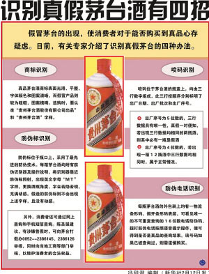 據她介紹,茅臺酒廠目前在北京專設了多名打假人員,通過明察暗訪的方式,尋訪假酒的線索。一旦發現假酒,將舉報工商部門或以法院起訴的方式“打假”。她說,目前打假人員還是主要針對高檔餐廳、酒店和超市進行打假。對一些小的煙酒店所賣的假茅臺酒,他們暫不作為“打假”重點。莫律師承認,目前在市場上存在著大量假茅臺酒,但針對“出了貴州,就喝不到真的茅臺”和“茅臺酒中80%是假酒”的傳言,她表示假酒并無傳言中的那樣多。