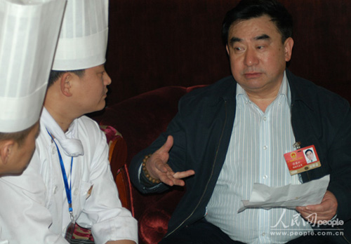 全國人大代表、湘菜大師許菊云與酒店大廚在進行交流。人民網(wǎng)記者 李昉 攝 人民網(wǎng)北京3月3日電 (記者 李昉) 食品安全事故的發(fā)生,在一定程度上對消費者造成恐慌,讓民眾對食品安全產(chǎn)生信任危機,這也成為了今年兩會廣泛關注的話題之一。那么,如何才能堵住食品安全生產(chǎn)漏洞呢?全國人大代表、湘菜大師許菊云建議嚴把源頭、餐桌、意識三道關。
