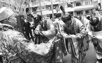 下午2點,幽幽的古樂響起,著漢服的數位老人和18位青少年再現古時成人禮!罢埿泄诙Y,”在洪亮聲音下,長者們為青年戴“冠”并整理端正。18位青年向父母行大禮,感謝養育,再向師長行大禮,感謝教育。據了解,成人禮自周代就有,當時稱為“冠笄之禮”,男孩行“冠禮”,女孩則行“笄禮”。60歲老者羅世明穿著漢服下臺來,他是行禮的長者,“現在年輕人似乎已忘了傳統道德和禮儀,希望他們從國學文化中重新了解中國傳統文化,端正自己。”