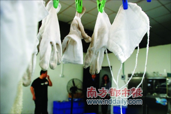 “要客戶收貨,就一定要讓所有的餐具上不能有一點油漬和殘渣,所以餐具打包裝之前,一定要用手套或毛巾擦干凈。”老板娘對記者說。然而,用于擦拭餐具的手套、毛巾都是隨處擺放,有的掛在電風扇上,有的甚至放在地上。大部分手套的指尖部位都已經發黑,甚至磨破了。