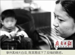 昨日(5月18日),在石龍公安分局探訪室,為爭奪撫養權,精心策劃炮制兒子被拐賣案的陳某霞,流下了后悔的淚水。2006年11月3日晚8時許,陳某霞報案稱,其3歲半的兒子周某龍買東西時失蹤,懷疑被人拐賣。石龍警方迅速成立專案組,開展了長達2年半的偵查。今年5月16日,石龍分局“打拐”專業隊連續奮戰22小時,成功破獲了這起拐騙兒童案,解救兒童1名,抓獲涉案人員2名,宣告了“打拐”專項行動首戰告捷。