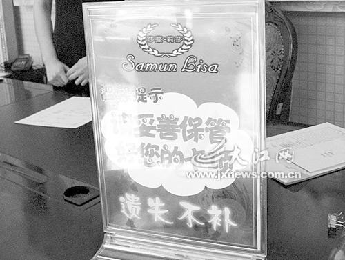 5月31日,記者陪同蔣女士來(lái)到莎蔓莉莎美容院。記者注意到,莎蔓莉莎美容院前臺(tái)擺放的提示牌十分醒目,上面注明“請(qǐng)妥善保管好您的卡項(xiàng),遺失不補(bǔ),最終解釋權(quán)歸莎蔓莉莎美容院”。