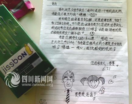 文中這樣寫道:“首先祝您父親節快樂,我今天送您一個特別的禮物,希望您不要生氣哦!知道您經常在外應酬,還要經常出差,為這個家又當爹又當媽。為了您的健康也是為了您的生活更快樂,我悄悄幫您買的最新款的TT哦!以前偷偷看到您的抽屜里是這個牌子的……”言語中,透露出女兒對父親的感激之情。最后,女兒還俏皮的說“希望您接受女兒的一片心意!!!哈哈……在此祝您節日快樂!也希望您能早點找個漂亮的女朋友哦,嘻嘻……放心,我不會給媽媽說的!”小女孩通篇用語樸實無華,天真無邪,讀來讓人感動。