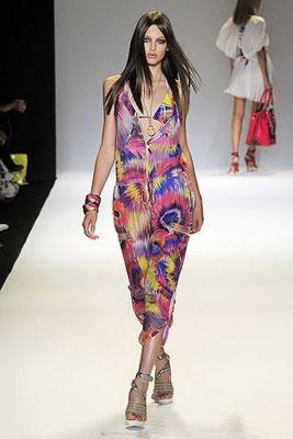 英國著名服裝設計師Matthew Williamson本季帶來了色彩斑斕的連體衣,嫵媚動人。甜蜜而繁復的扎染印花是夏天的味道,飽和的色彩,肆意的視覺刺激充滿異國情調。長至小腿中部,超低V領的簡潔廓形又有些嬉皮味道的調侃。這樣的連體衣,要避免繁榮復雜的細節搭配,簡單的配飾就足以讓你成為焦點。