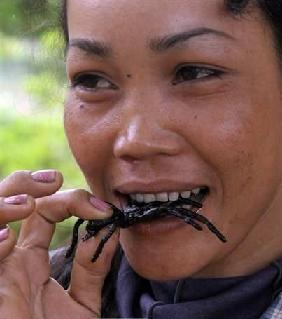 現在柬埔寨人用毒蜘蛛作佳肴宴請客人是常事了。去年記者到一處深山農場采訪。農場主人特地吩咐做油炸毒蜘蛛。為了不辜負主人盛情,我壯膽拿起蜘蛛,蘸著椒鹽、檸檬汁吃進嘴里,味道還不錯,有點像油炸蠶蛹的味道。現在來金邊的旅游者,不少人特地到街頭的市場上品嘗這種“蜘蛛小吃”。當地農民也因此多了一條生財的路子。
