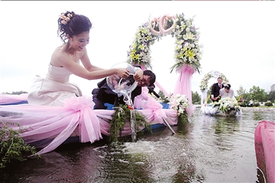 據(jù)了解,這個浪漫的水上集體婚禮的創(chuàng)意出于“百年修得同船渡”。記者了解到,整場水上婚禮的造價在5萬元左右,而每條花船費用為9999元。(胡雪柏)