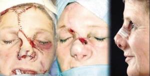 去年8月的一個深夜,她被一陣劇烈的咆哮聲吵醒,只見“奧利”正從床上跳下地面。普林塞斯回憶道:“我感覺一滴鮮血正從臉上滴下。由于疼痛難忍,我急忙下床沖進衛生間照鏡子。我打開燈,簡直不敢辨認鏡中的那個人—— 一切就像恐怖片中的鏡頭!”原來,在普林塞斯的面部中央,鼻子不翼而飛,只留下兩個如同金魚眼睛般大小的洞穴。出奇冷靜的她一邊高聲喊醒大兒子卡奇呼叫救護車,一邊用一條沾了水的毛巾將面部緊緊裹住。