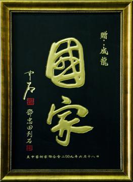 纖維玉石雕刻的書法作品《國家》是由中國知名雕刻家、書法家邵忠田先生特別雕刻制作,并贈送給成龍先生的。據了解,纖維玉石是一種鮮為人知的礦石,孕育在位于長江和黃河之間的秦嶺深處,這種特殊玉石歷經幾億年形成,深埋地下,柔軟如膠,一經開采出來,迅速變得致密堅硬,質地細膩,溫潤光澤,是雕刻方面的最佳選材,迄今未在世界其他地方發現,極具收藏價值。