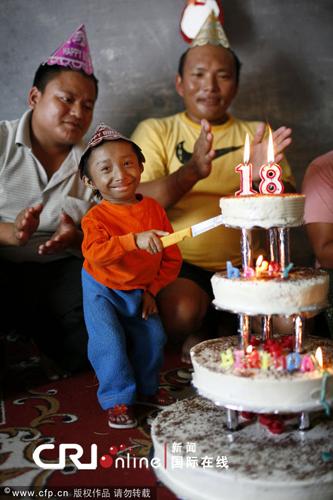 2009年10月10日,尼泊爾波卡拉,卡根德拉·塔巴·馬加爾(Khagendra Thapa Magar)在一個和自己身高差不多的蛋糕前慶祝生日。據(jù)悉,他的生日愿望是找一個和自己一樣袖珍的老婆。10月14日他將年滿18周歲,屆時身高只有51厘米的他將可以正式被吉尼斯世界紀(jì)錄確認(rèn)為世界上最矮的人