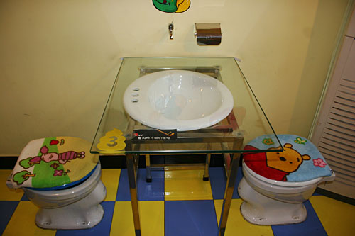 小小的門面,狹窄的樓梯。走上二樓后,這個布置得充滿了童趣的餐廳才展現在食客面前。這里的每把座椅都是一座標準的沖水馬桶。盛放主餐的不是盤子,而是微型馬桶,冷飲則大都放在“蹲坑”形狀的便器里。好在這些餐具造型卡通,并不會讓人大倒胃口。