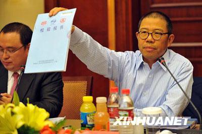 11月30日,農(nóng)夫山泉股份有限公司董事長鐘睒睒在新聞發(fā)布會上展示有關(guān)部門出具的同批次產(chǎn)品的檢驗(yàn)合格報(bào)告。新華社記者王定昶攝
