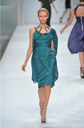 不對(duì)稱垂懸式肩袖,在身后形成飄逸的線條,前胸和腰間的圍裹設(shè)計(jì),則是希臘風(fēng)格常見的手法。