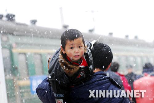 1月23日,一名外來務工人員扛著孩子在煙臺火車站登車。
