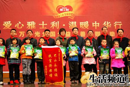 “愛心雅士利 溫暖中華行”千萬陽光工程全國公益捐贈活動,由國務院扶貧辦、中國扶貧開發協會、《中國扶貧》雜志社及中華慈善國際互聯網救助中心主辦,廣東雅士利集團股份有限公司承辦,全國各省、市、自治區、直轄市公益慈善機構共同參與。遠赴重慶潼南縣的他們,為這里的孩子帶來他們需要的奶粉、學習用品等,用這些點滴愛心,伴隨他們健康成長。重慶電視臺、《重慶日報》、《重慶晨報》、《重慶商報》、《重慶時報》、潼南電視臺、《潼南報》等媒體記者也到場進行采訪報道。