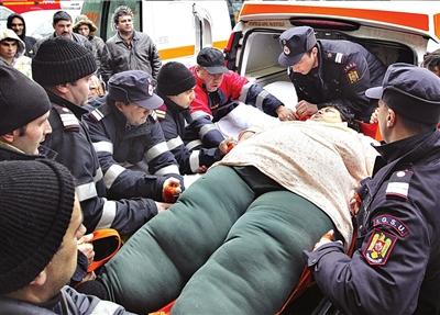 維多利亞17日抵達布加勒斯特大學附屬醫院后,人們用擔架將她抬下。圖/人民圖片